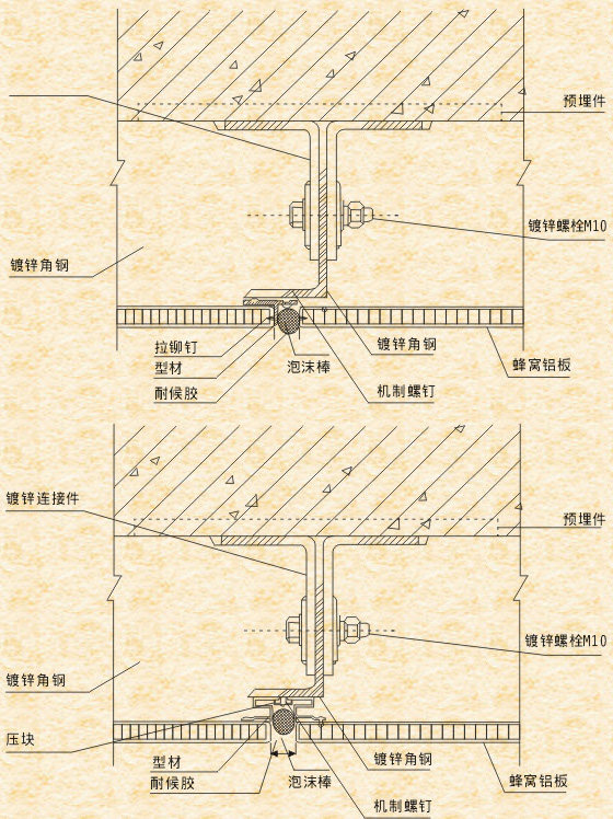 五、鋁蜂窩板幕墻的框架應使用表面經陽極氧化處理的鋁型材,不可使用鋼型材。因框架與壁板若是2種不同的金屬,容易產生電極電位差,使鋁板受到腐蝕。高層建筑鋁蜂窩板幕墻框架使用的鋁型材厚度不得小于3mm。安裝壁板時要使用不銹鋼螺絲或鍍鋅螺絲,不能使用普通螺絲。框架系統(tǒng)的每根豎料應與主體結構的預埋減牢固連接,橫料與豎料間再以不銹鋼螺栓固定,保證安裝后耐久性。